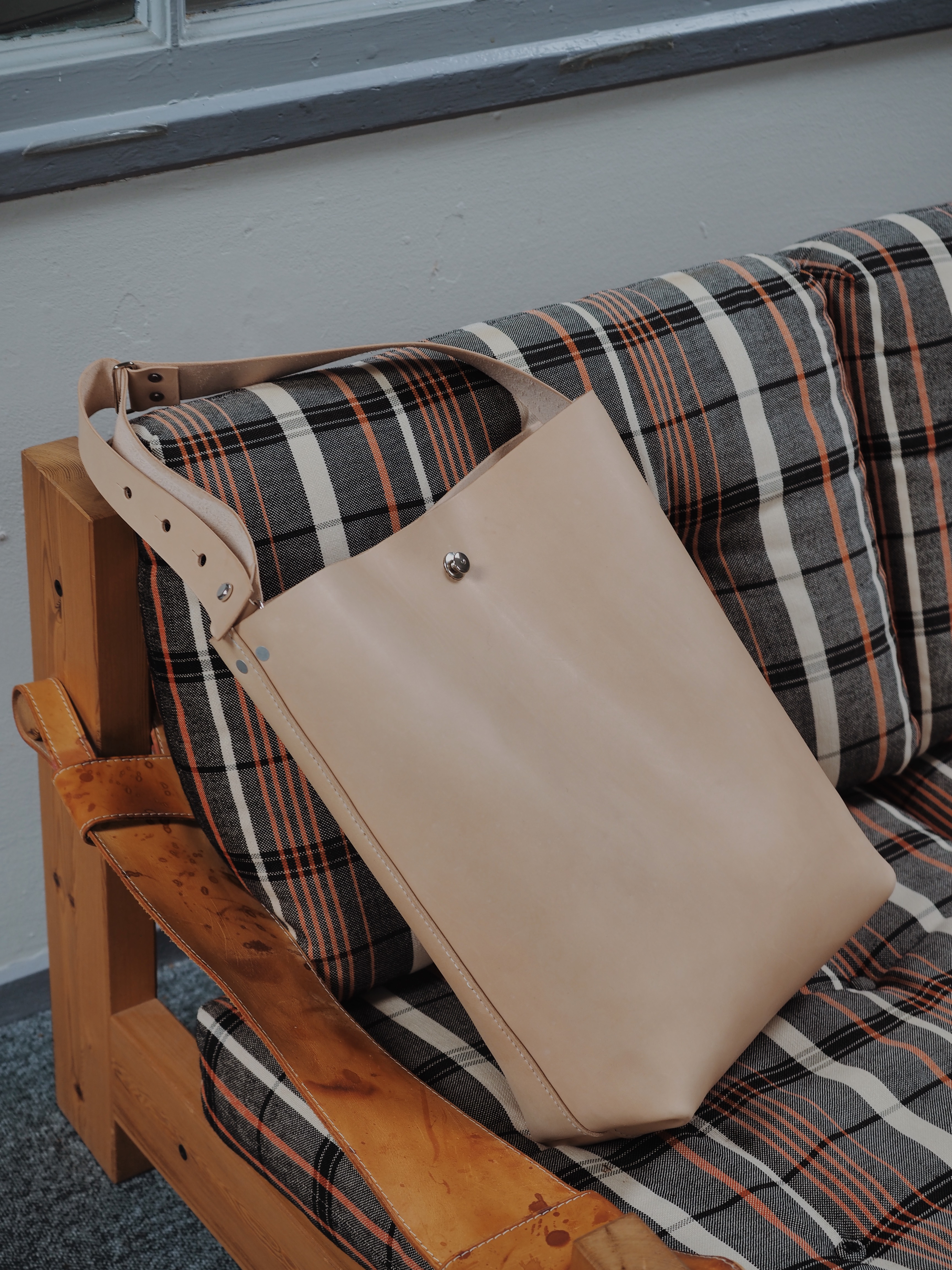 Tasken fra SVEND er fremstillet i et minimalistisk design, men rig på detaljer, som nitter, logoet med spiren i siden og de indvendige sømme af bunden. Tasken er håndsyet i tyk, kromfri kernelæder. Kernelæderet er vegetabilsk garvet og fremstillet på garveri i Sverige.